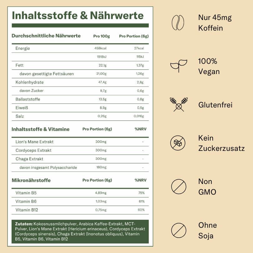Zutaten: Kokosnussmilchpulver, Arabica Kaffee-Extrakt, MCT-Pulver, Hericium Extrakt (Hericium erinaceus), Cordyceps Extrakt (Cordyceps sinensis), Chaga Extrakt (Inonotus obliquus), Vitamin B5, Vitamin B6, Vitamin B12